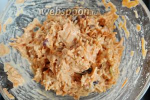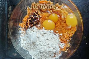 З’єднаємо подрібнені моркву, яблука, 50 г фініків з 3 яйцями і 100 г борошна.