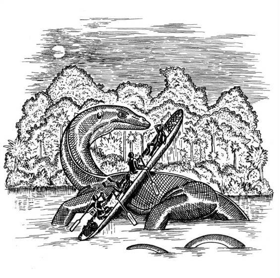 Мокеле-мбембе – криптид, дуже схожий на динозавра Конгамато з Конго. Його ім’я означає «той, хто зупиняє перебіг річок» – мається на увазі його гігантський розмір. Намагалися знайти Десятки експедицій це істота, але поверталися тільки з розповідями очевидців і знімками відбитків величезних лап.