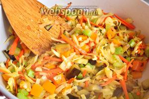 Потім до овочів додати 1,5 склянки добре промитого рису, перемішуємо і смажимо ще 2 хвилини всі разом.