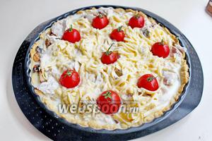 Куряча грудка 500 гОлія соняшникова рафінована 1 ст. л.Перець чорний мелений 1 щіпкаПомідори черрі 10 шт.Вершки 10% – 300 млСіль 1 щіпкаСир твердий 200 гТісто пісочне 400 гЧасник 1 зубчикПечериці свіжі 300 гЯйця курячі 3 шт.