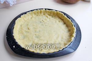 400 г тіста розкачати трохи більше, ніж діаметр форми, викласти його у форму, зробити проколи вилкою і прибрати в холодильник хвилин на 30. Потім вийняти з холодильника, викласти на тісто вантаж (квасоля, горох) і випікати 15 хвилин при 190°С.