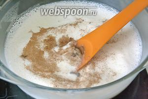 Коли молоко закипіло, то відразу вимкнути плиту і додати всі спеції (3 гвоздики, 2 щіпки імбиру, 3 щіпки кориці, 2 щіпки мускатного горіха) в молоко. Перемішати і залишити хвилин на 10-15 настоюватися.