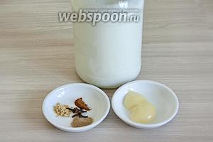 Для рецепта знадобиться молоко, мед, мускатний горіх мелений, кориця мелена, імбир мелений, гвоздика.