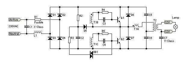 До галогенним лампам дозволяється приєднувати тільки низькочастотний електронний трансформатор. Схема підключення складається з резисторів дипольного типу. Конденсатори застосовуються з первинною обмоткою. Для стабілізації процесу індукції використовуються фільтри. Усього в схемі передбачено два підсилювача. Реле в даному випадку встановлено за конденсаторами.