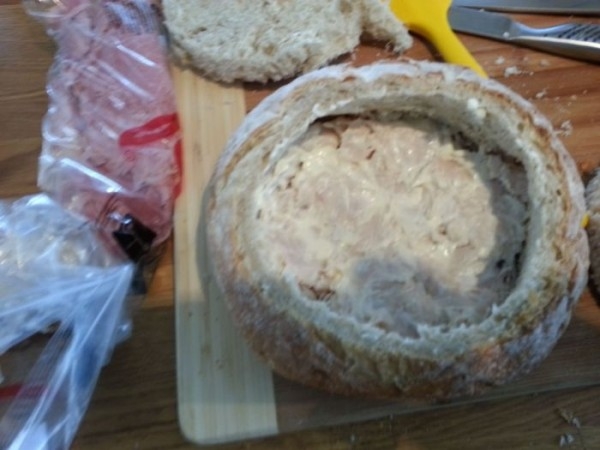 Потім беремо буханець круглого хліба, відрізаємо верхівку і видаляємо хлібний м’якуш, залишаючи один шматочок, він нам ще знадобиться.