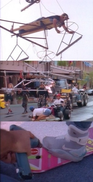 Крім того, інженерам довелося придумати складну систему ременів, яка кріпилася на крані. До ременів підвішували акторів, і ті мало не по-справжньому літали в повітрі. Найбільше глядачів вражали кадри, коли акторів показували нижче колін, з ширяючими ховербордами і ногами на них. Щоб зняти ці епізоди, до дощок намертво привинчивали взуття, героїв фільму саджали на спеціальну установку і возили, поки все дійство знімала камера
