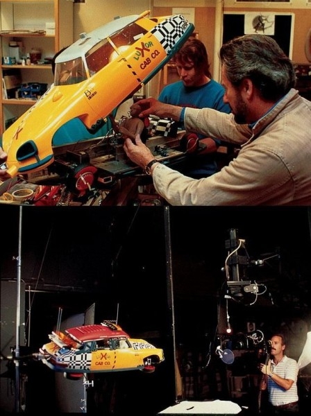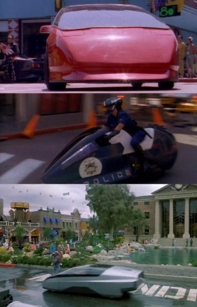 А ось літаючі машини в сцені, коли Марті виходить у місто майбутнього, додавали пошарово, прямо як в Photoshop: спочатку детально опрацьовувалася траєкторія одного автомобіля, потім іншого і т. д. В кінці кінців всі макети були зняті на синьому тлі, як того вимагав Роберт Земекіс, і «склеювалися» з натурними кадрами