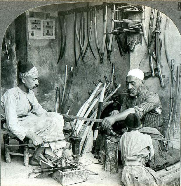 Для виготовлення лез на Близькому Сході імпортувалася булатная сталь з Південної Індії. Такі клинки славилися міцністю і стійкістю до осипання. Оригінальний спосіб отримання дамаської сталі не відомий, а свою назву вона отримала в честь столиці Сирії – Дамаск. Сучасні спроби відтворення металу виявилися цілком успішними із-за відмінностей в сировину і технології виробництва. Репутація і історія дамаської сталі породили безліч легенд, таких як здатність розрізати волосся, що падають поперек леза. Незважаючи на те, що певні види сучасної стали перевершують ці мечі, процес їх виробництва є досить прогресивним для свого часу.