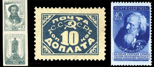 Так само серед филателистиских раритетів можна відзначити негашене синю 10-копійчану марку СРСР 1925 року, яка була продана за $18 500, негашене поштову марку СРСР з портретом Менделєєва з випуску «Вчені нашої Батьківщини», оцінюється в $11 500, а так само вертикальну беззубцовую зчеплення марок СРСР 1937 р. номіналом 40 і 50 копійок з серії, випущеної до сторіччя з дня смерті Пушкіна. Її ціна на аукціоні склала $9 500.
