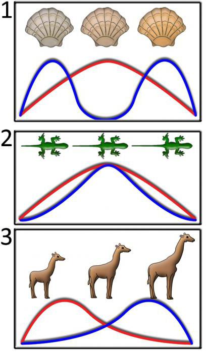 Диверсифікаційний (підривної) Забарвлення шерсті тварин в залежності від середовища проживання і сезону, зміна розмірів тіла з плином часу