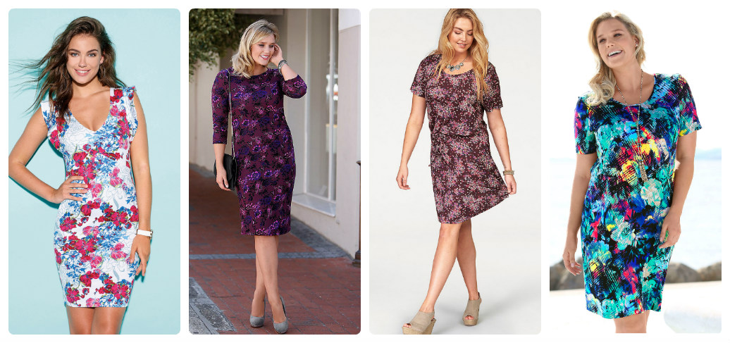 Незважаючи на поширену думку, короткі сукні (значно вище коліна) також чудово підкреслюють красу пишних форм. Особливо якщо мають округлий виріз (з глибоким декольте або без) і квіткову забарвлення.