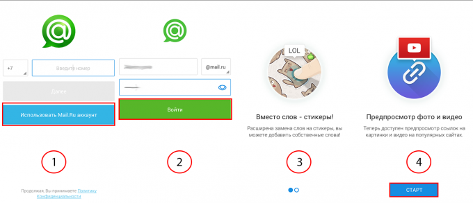 2. Вхід у систему з використанням облікового запису Майл.ру, дуже швидкий і простий. У відповідному вікні, переходимо «Використовувати Майл.ру обліковий запис» і вводимо електронну пошту і пароль від неї, потім натискаємо «Увійти». Перегортаємо підказку до кінця і натискаємо «Старт».