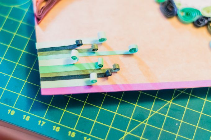 9. Низ композиції теж не варто залишати порожнім. Травичку можна зробити їх таких же смужок, що використовувалися для оформлення крони. Для цього один кінець смужки скрутити в спіраль, а інший приклейте до основи. Якщо ширина і довжина смужок при оформленні трави буде різною, це зробить картину більш цікавою.