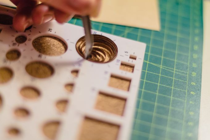 • – інструменти для квілінгу (стік з роздвоєним жалом, шаблон, шило, щипці, шпильки)