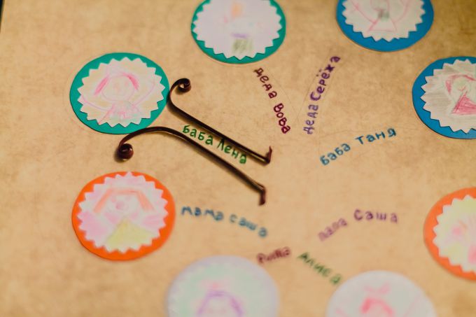 2. Намалюйте на аркуші основи контури майбутнього дерева, на кінцях гілок приклейте портрети, які стануть яблучками. А на самих гілках напишіть імена. Всі написи необхідно робити до того, як почнете приклеювати контури і роли!