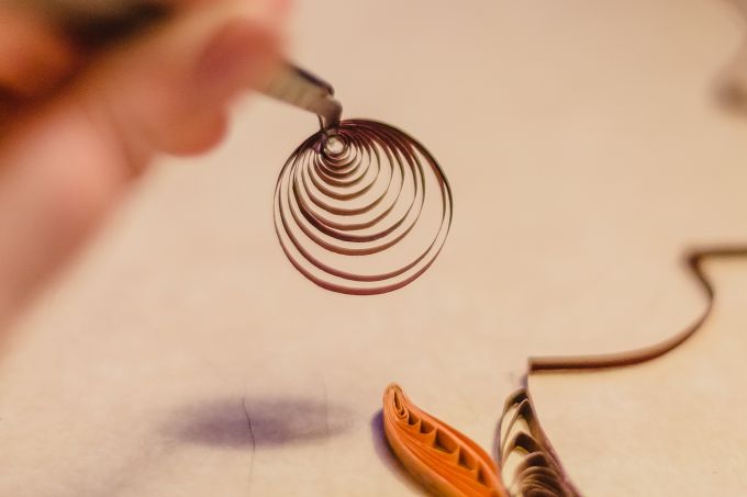 5. Коли рол трохи розкрутиться, капніть клей ПВА на кінчик смужки і приклейте її до ролу. За допомогою шпильок або спеціальних шаблонів такий рол можна перетворити в краплю, лист, трикутник і т. п.