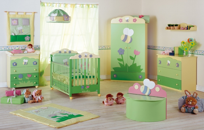 - Дитяче ліжечко. У перший час це самий головний предмет інтер’єру. Ліжечко необхідно вибирати ретельно. По-перше, вона повинна бути виготовлена з дерева з використанням тільки безпечних лакових покриттів і фарб. Переконайтеся, то відстань між прутами бортиків не більше 5-6 см і дитина не зможе просунути туди голову. Краще, щоб бортики знімалися. Це дозволить у разі необхідності відкрити одну сторону ліжечка і присунути до батьківського ложу. Такий стан буває зручним, якщо малюк погано спить або хворіє. Якщо необхідно заощадити простір кімнати, можна придбати ліжечко-трансформер. Вона має ящики для зберігання білизни і поверхня для сповивання. Також вона може розкладатися на стандартну дитяче ліжко і компактний комод.