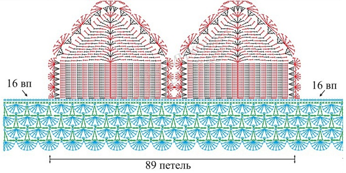- Потім в’яжіть за схемою цикли з 6 с. б.н + 3 в. п. між ними. На цьому ж етапі відразу обвязывайте за схемою кутові арки.