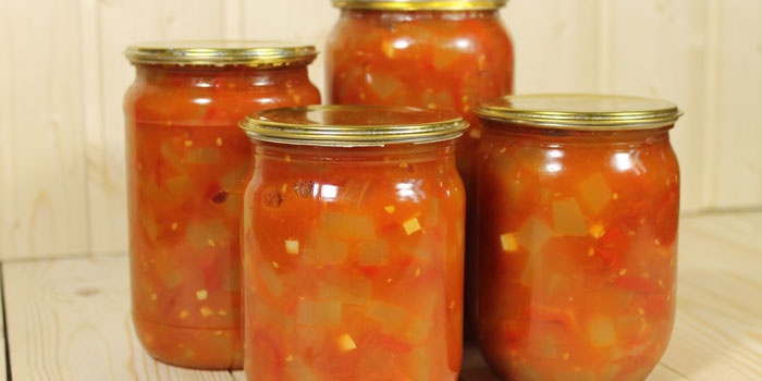 - Інгредієнти заливаються соусом. Стерилізація заготовки триває 10 хв., після консервація закривається кришками.