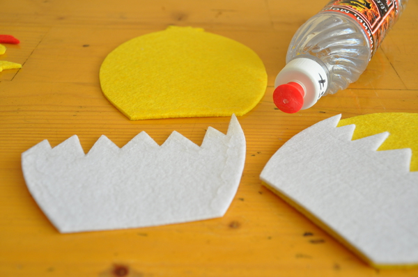 4. Збираємо двох курчат. На деталь шкаралупи по периметру наносимо прозорий універсальний клей. Приклеюємо шкаралупу до корпусу курчати