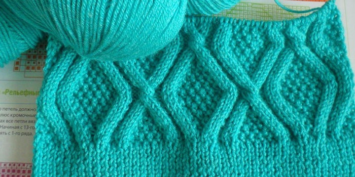• Смужки з ромбів. Тут слід постаратися оптично виділити ромбоподібний малюнок за допомогою того, що ліворуч і праворуч основного малюнка пров’язати частина виворітного ряду гладдю. В’язати потрібно за схемою в двадцять одну петлю.