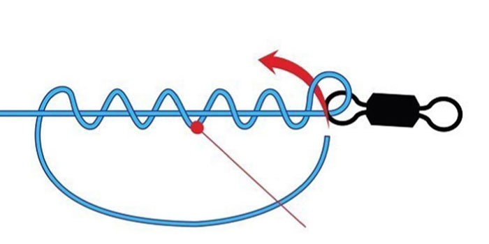 - Зробіть 11-12 витків, просуньте робочий кінець в петлю товстої леси. Останню зробіть поменше, потягнувши за вільний край. Вузол змочіть і акуратно затягніть з допомогою робочого кінця тонкої нитки.