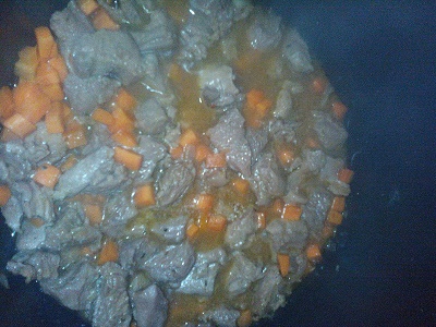 Поки підсмажується м’ясо, займаємося морквою і капустою. Тут процедура стандартна, чистимо, миємо, нарізаємо. Моркву на дрібні кубики або брусочки, а капусту – не мельчим, але і великі фрагменти не залишаємо.