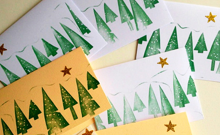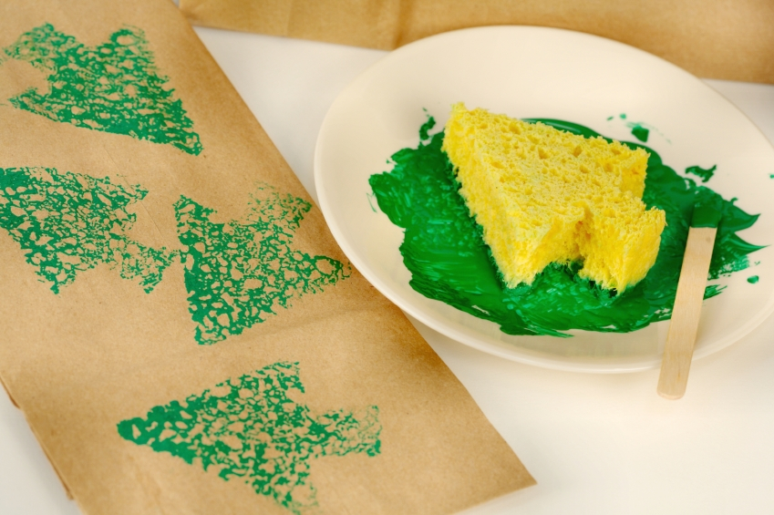 Наприклад, Ви можете вирізати з губки для миття посуду ялинку. Щоб створити малюнок на папері, занурте заготівлю фарбу і нанесіть відбитки на аркуш.