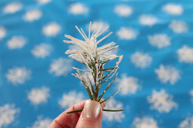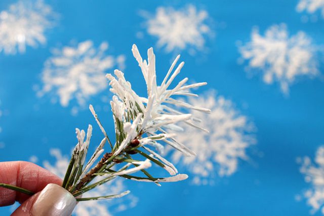 Замість заготовлених основ можна застосувати рослини для малюнка. За допомогою ялинової гілки виходять оригінальні сніжинки.