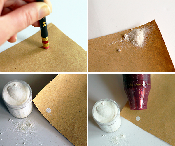 Занурте зворотний бік олівця в клей і нанесіть його на папір. Потім насипте на клейовий розчин сіль. Після його висихання, у Вас залишаться снігові горбки. Або використовуйте спеціальні термосредства.