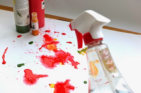 Для цього розстеліть папір на столі. Занурте кисть у фарбувальну рідину і різко махніть.