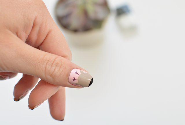 Крок 2. Світло-коричневим лаком для нігтів нанесіть пензликом півколо на кожному нігті. Його вершина повинна бути спрямована в бік основи нігтя. Зробіть два мазка у формі вушок.