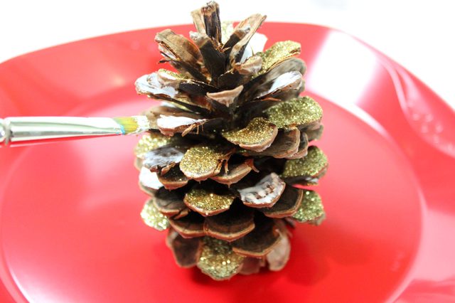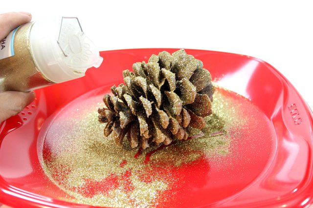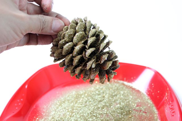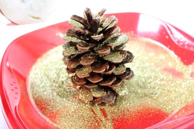 Крок 3. Підніміть шишку і притрусіть її над тарілкою. Так зайві блискітки обсиплються. Залишився декор зберіть назад в баночку. Його можна застосовувати повторно.