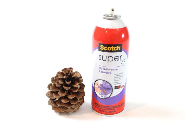 Крок 1. Для того щоб клей рівномірно нанести на шишку використовуйте аерозольну форму. Розпилюйте його на шишку, поступово перевертаючи її. Якщо такого клею у Вас немає, тоді зробіть густий розчин клею ПВА і налийте його у флакон з розпилювачем.