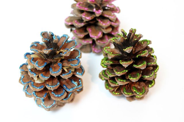 Самий яскравий декор виходить з використанням блискіток. Вони перетворюють навіть найпростіші предмети в святкові прикраси. Існує кілька методів нанесення чарівної пилу на шишки.