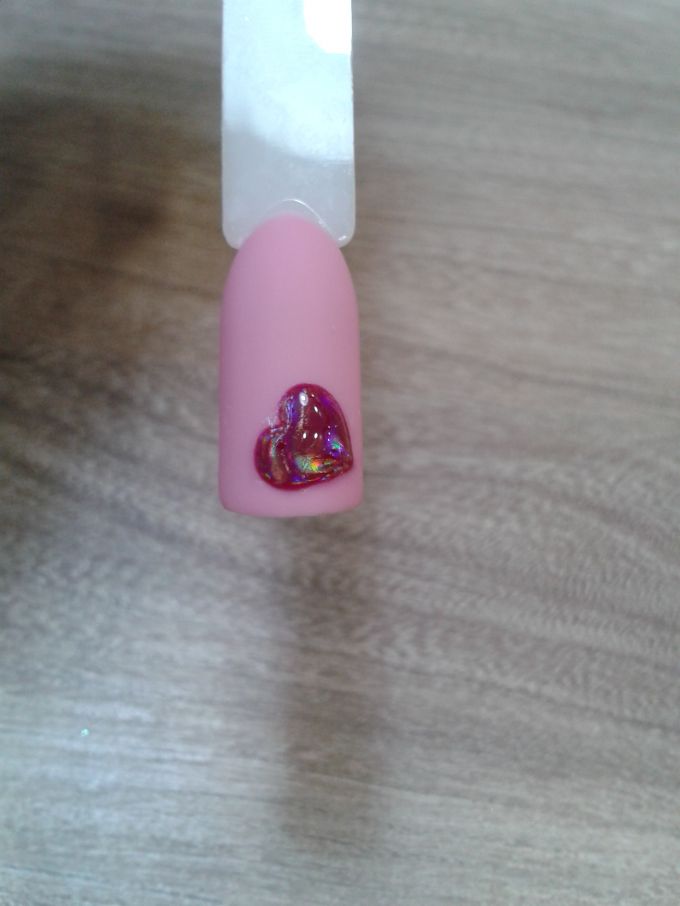 2. Бордовим гель-лаком малюємо сердечко. Якщо колір нещільний, то промальовуємо в кілька шарів, і кожен шар сушимо в лампі. На липкий шар сердечка отпечатываем прозору фольгу. Виходить дуже красивий, грає на світлі ефект.