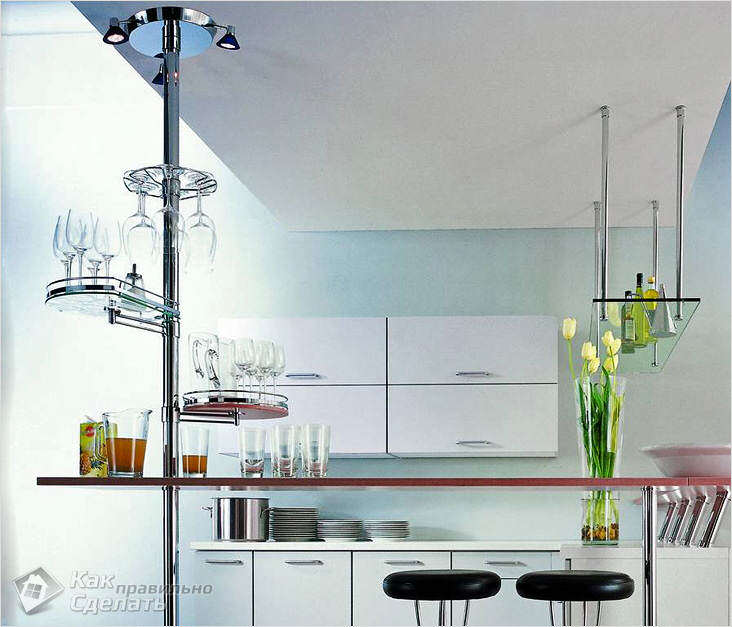 Облаштовуючи стійку, необхідно грамотно і красиво задіяти простір над нею. Тут можуть розміщуватися полиці і навіси для фужерів, кошики для фруктів, серветниці. Зробивши таке багатофункціональне деревце, ви задіюєте простір і прикрасите приміщення.