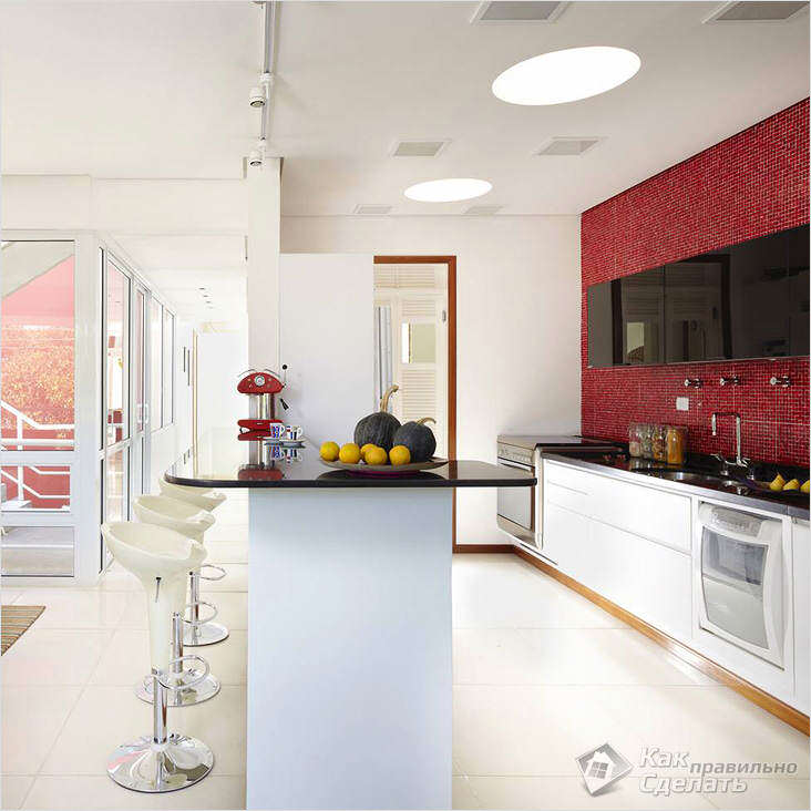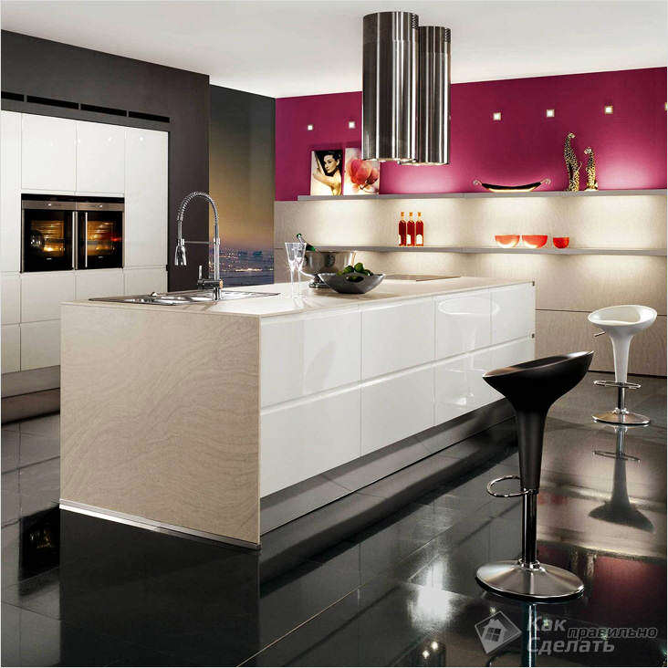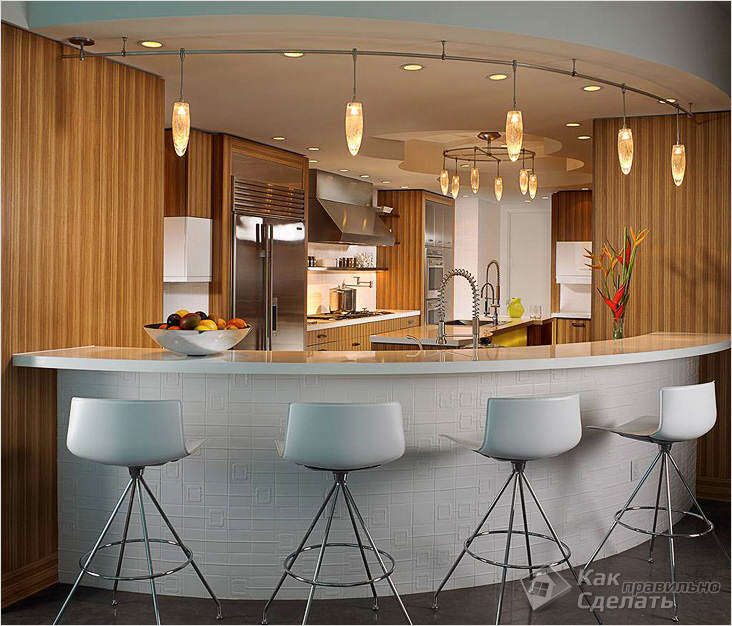 • Ще один варіант – це коли барна стійка встановлюється у центрі кухні з великою площею. При цьому стійка є продовженням варильної панелі і мийки. Дана модель підходить не всім, але теж знаходить своїх шанувальників.