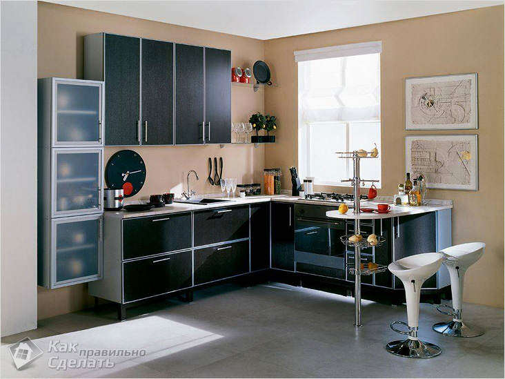 При наявності маленької кухні не обов’язково відмовляти собі в барній стійці. У цьому випадку вона поєднується з обідньою зоною, але робиться трохи вище стола. Не варто робити стійку занадто високою, оскільки в невеликому приміщенні це буде виглядати недоречно. Оптимальним варіантом стане продовження робочої поверхні або стільниці, тобто розташування в одній площині з іншими предметами.