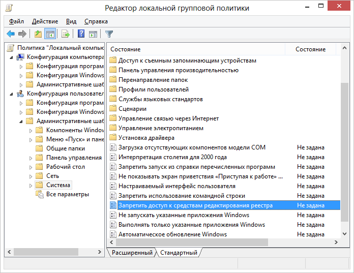 Самий простий і швидкий спосіб відключити заборона редагування реєстру — використовувати редактор локальної групової політики, однак він доступний тільки в Професійної та Корпоративної редакціях Windows 10 і 8.1, також в Windows 7 максимальна. Для Домашньої редакції використовуйте один з наступних 3-х методів включити редактор реєстру.
