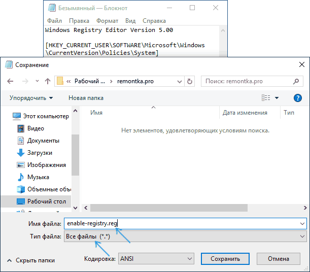 Ще один метод, на випадок, якщо .bat файлів, командний рядок не працюють — створити .reg файл реєстру з параметрами, які розблокують редагування і додавання цих параметрів реєстру. Кроки будуть наступними: