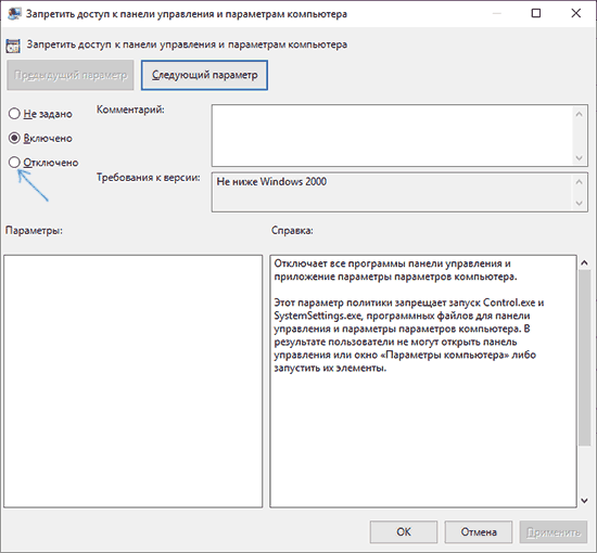 - Звичайно, назви політик говорять за себе. Наприклад, у мене на скріншоті видно, що заборонений доступ до панелі управління, до запуску зазначених додатків Windows, командному рядку і редактора реєстру. Для скасування обмежень досить двічі натиснути по кожному з таких параметрів і встановити «Вимкнено» або «немає», а потім натиснути «Ок».