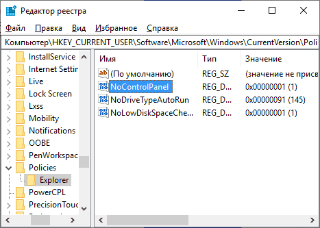 - Заборона запуску панелі управленияHKEY_CURRENT_USERSOFTWAREMicrosoftWindowsCurrentVersionPoliciesПотрібно видалити параметр «NoControlPanel» або змінити його значення на 0. Для видалення достатньо натиснути правою кнопкою миші по параметру і вибрати пункт «Видалити». Для зміни — подвійний клік мишею і завдання нового значення.