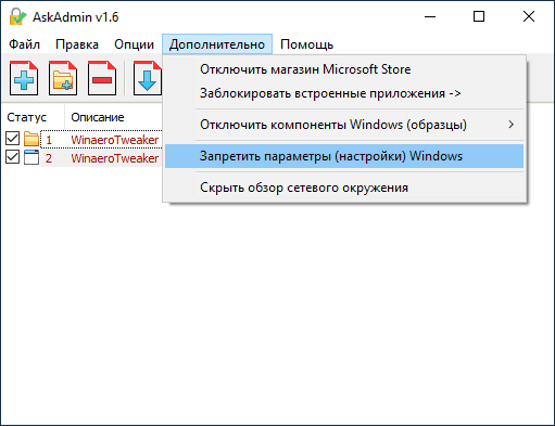 Утиліта AskAdmin має зрозумілий інтерфейс російською мовою. Якщо при першому запуску російська мова не включився автоматично, в головному меню програми відкрийте «Options» — «Languages» і виберіть його. Процес блокування різних елементів виглядає наступним чином: