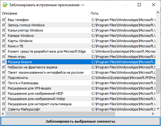 • Блокування вбудованих додатків Windows 10 доступна в пункті меню «Додатково» — «Заблокувати вбудовані додатки». У списку можна вибирати кілька додатків, утримуючи клавішу Ctrl при натисканні мишею.