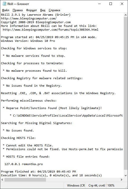 Додатково перевіряється файл hosts і посилання файлової системи NTFS (вони не змінюються, але про них вас повідомлять у звіті програми). При цьому безпосереднього видалення загроз не відбувається, передбачається, що після RKill ви будете використовувати інші популярні засоби видалення шкідливих програм з комп’ютера, запуску яких до цього щось заважало.