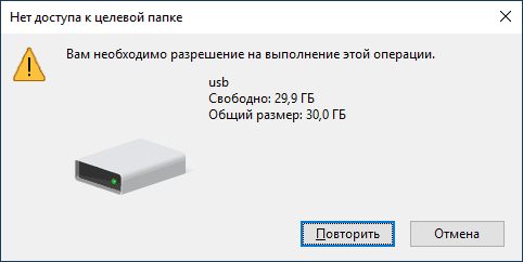 У цій інструкції про те, як виправити помилку «Немає доступу до цільової папки» для системних папок Windows 10, 8.1 і Windows 7 (перший розділ статті) і цю ж помилку на флешки і інших USB-накопичувачів (друга частина). У всіх випадках, щоб виконати зазначені дії ви повинні мати права адміністратора на комп’ютері.