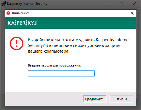 Антивірус Касперського серед інших налаштувань має опцію захисту паролем: після установки пароля недоступне зміна параметрів, а також видалення антивірусу (відноситься і до інших продуктів, таким як Kaspersky Internet Security, Total Security): при спробі видалення ви побачите вікно «Введіть пароль».
