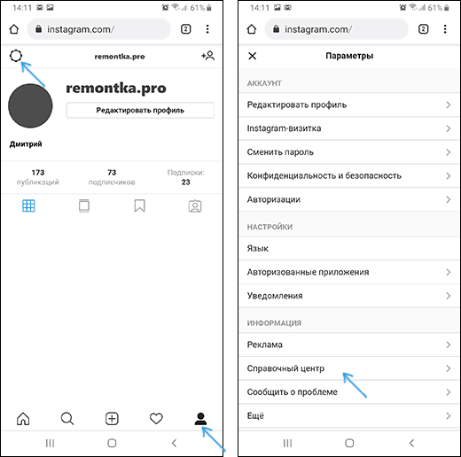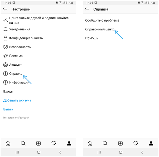 • У налаштуваннях виберіть пункт «Довідка» — «Довідковий центр». У браузері телефону відкриється сайт довідкового центру Instagram, перейдіть до кроку 5.