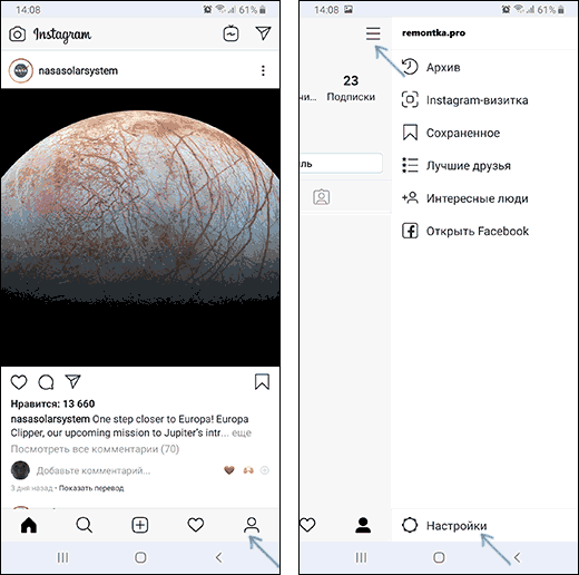 • У додатку натисніть по значку профілю (внизу праворуч), потім — по кнопці меню праворуч угорі. У меню, клацніть по пункту «Налаштування».
